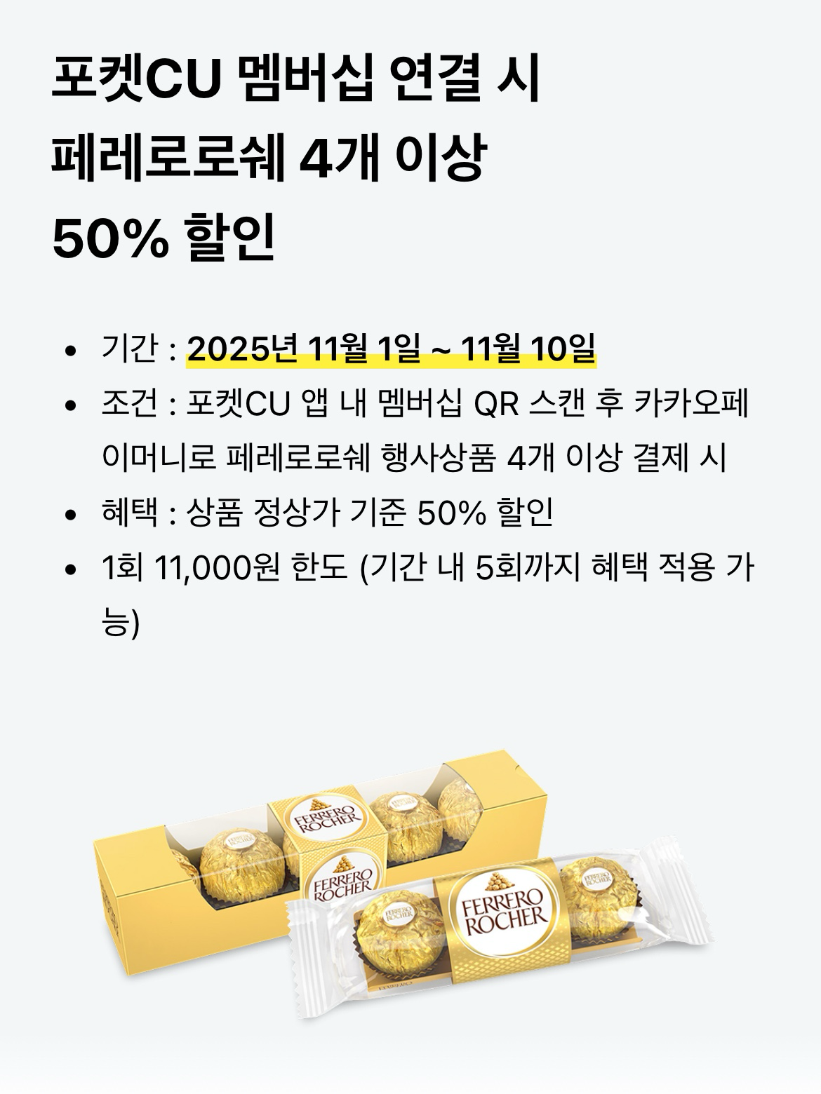 ✅ 2. 포켓 CU 멤버십 카카오페이 연결 시, 페레로로쉐 50% 할인