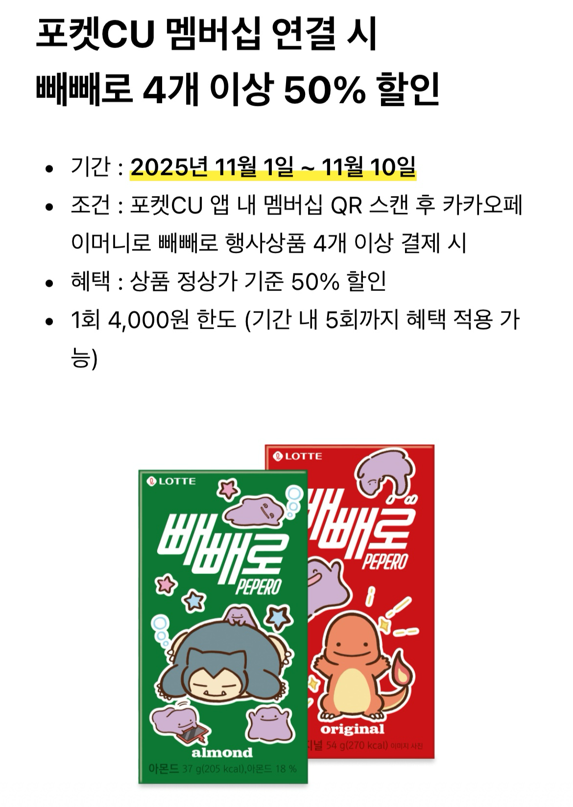 ✅ 1. 포켓 CU 멤버십 카카오페이 연결 시, 빼빼로 50% 할인