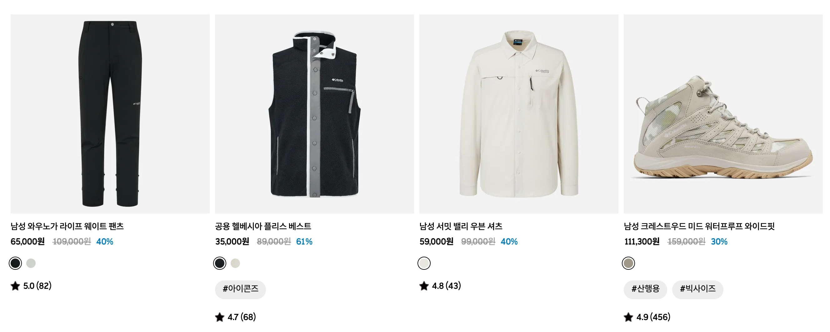 컬럼비아는 아웃도어 라이프스타일을 위한 폭넓은 제품군을 제공합니다. 특히 겨울철 Omni-Heat 다운 자켓과 여름철 PFG 라인은 브랜드를 대표하는 시그니처 제품군입니다.