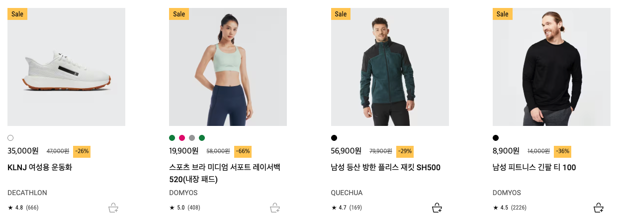 | 러닝 & 피트니스 | Kalenji, Kiprun, Domyos | (Kalenji) 입문 러닝화·의류 (Kiprun) 퍼포먼스 러닝화·의류 (Domyos) 요가 매트, 홈트 용품, 트레이닝복 |