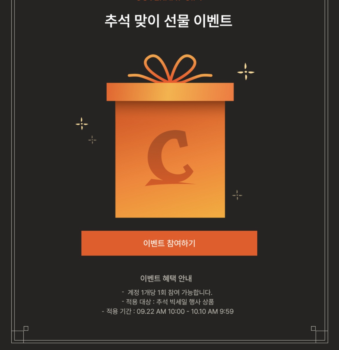 더불어 아울렛 전용 10% 쿠폰과 신상품 전용 5% 쿠폰이 제공되어 할인 폭을 한층 넓힐 수 있습니다. 마지막으로, 추석 선물 이벤트가 함께 진행되어 계정당 1회 참여가 가능하며, 행사 상품 구매 고객을 대상으로 추가 혜택이 주어집니다.