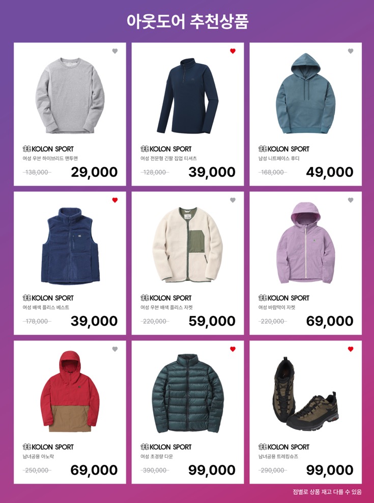 ✅ 이번 코오롱 추석 콕세일은 아웃도어부터 골프웨어, 남성복·여성복·잡화까지 전 품목을 아우르는 역대급 할인 혜택을 제공하는 만큼, 합리적인 가격에 코오롱스포츠와 다양한 브랜드의 인기 아이템을 구매할 수 있는 기회입니다.