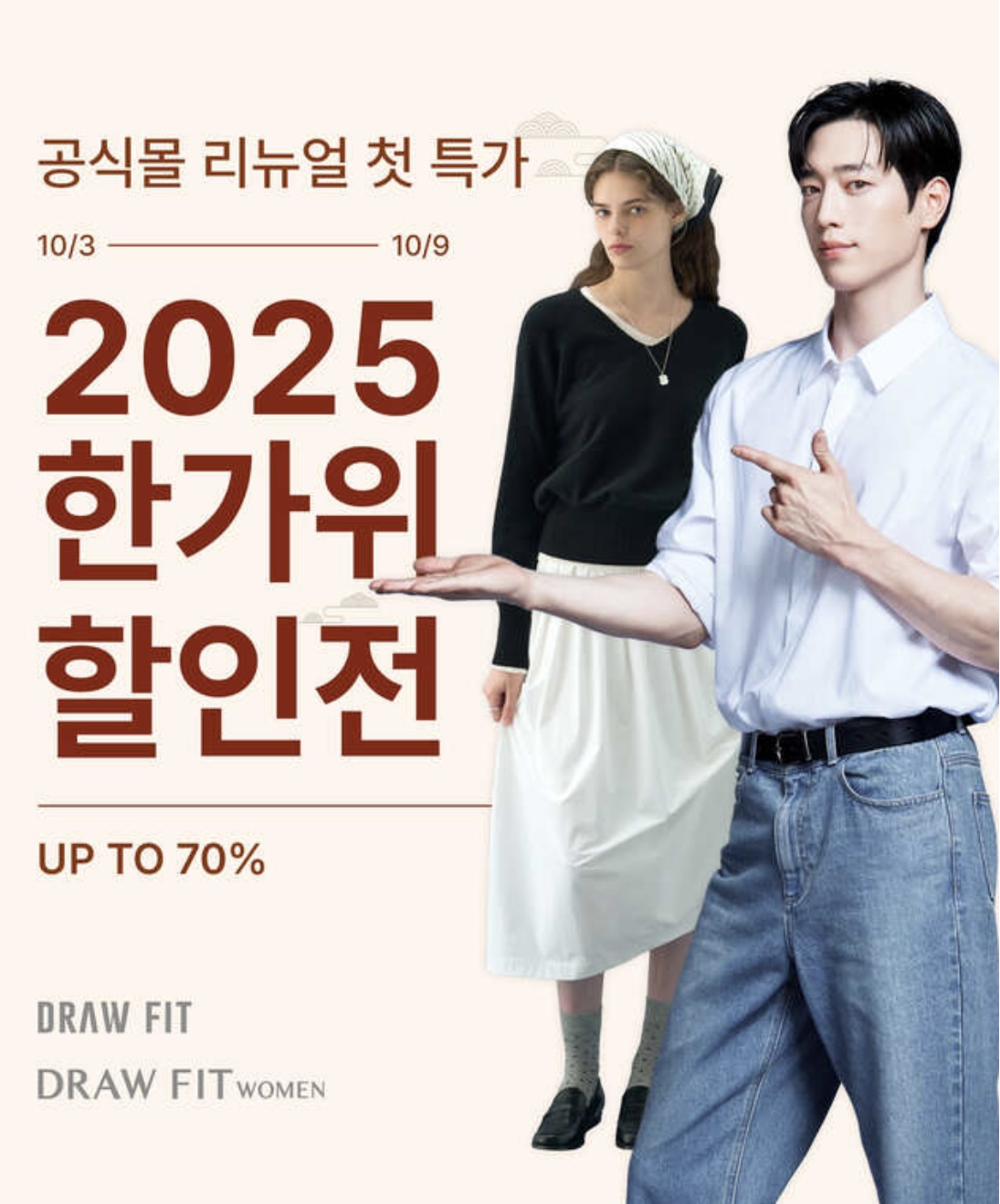 모던 미니멀 감성으로 사랑받는 패션 브랜드 드로우핏(DRAW FIT)이 공식몰 리뉴얼을 기념하며 ‘2025 한가위 할인전’을 진행합니다.