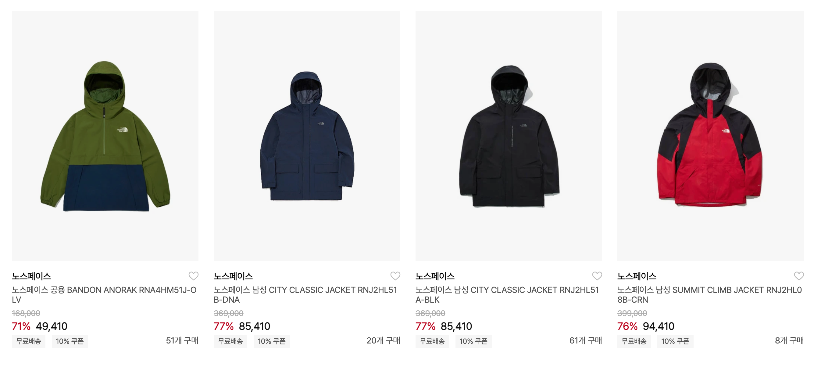 - 스포츠/아웃도어: 네셔널지오그래픽 패딩, 컬럼비아 패딩, 노스페이스 경량패딩, 노스페이스 패딩, 몽벨 경량패딩, 몽벨 바람막이, 언더아머 운동화, 푸마 신발 등