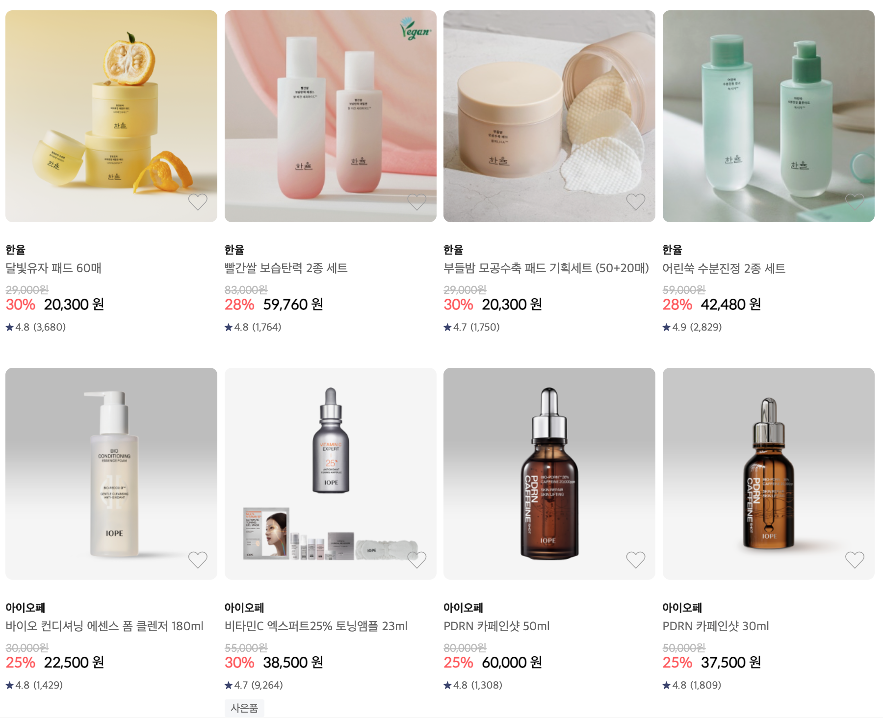 - 한율 : 어린쑥 수분크림, 달빛유자 슬리핑팩, 달빛유자 패드, 빨간쌀 보습탄력, 부들밤 모공수축 패드, 어린쑥 수분진정