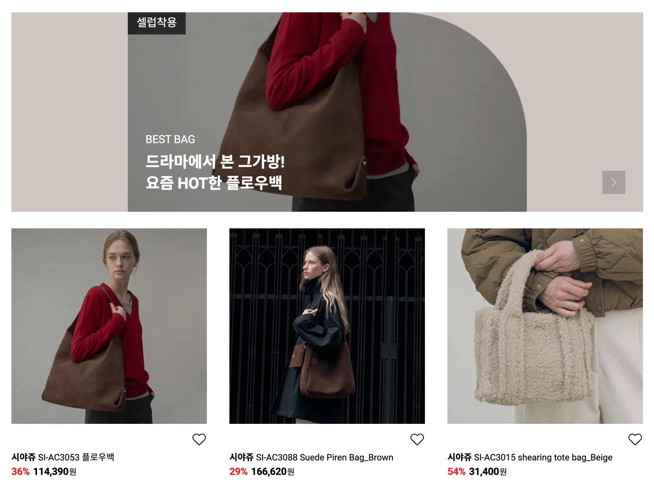 3️⃣ 셀럽 착용 베스트셀러 특가전 – 시야쥬 스웨이드 플로우백 9만 원대