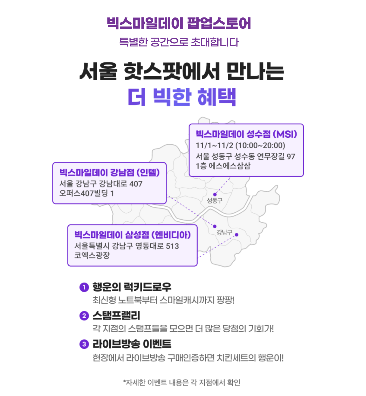 - 온라인 혜택, 이벤트 뿐만 아니라 빅스마일데이 오프라인 팝업스토어 이벤트도 진행될 예정입니다. 빅스마일데이 강남점(인텔), 빅스마일데이 성수점(MSI), 빅스마일데이 삼성점(엔비디아) 총 3곳에서 최신형 노트북부터 스마일캐시, 치킨세트 추첨 이벤트까지 다양한 이벤트가 진행될 예정이라고 하니, 근처에 거주하시거나 일정이 있으신 분들은 꼭 한 번 들리셔서 혜택 받아가시면 좋을 것 같습니다!