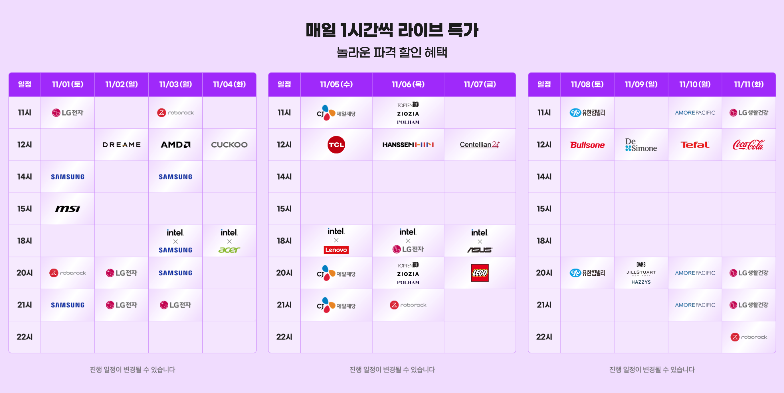 - 빅스마일데이 2025에서는 매일 라이브 특가가 진행 될 예정입니다. LG전자, 삼성전자, msi, 로보락, 인텔, 쿠쿠, acer 등 전통적으로 지마켓 빅스마일데이의 강점이자 차별점으로 꼽히는 전자기기 가전제품부터 시작해서 CJ제일제당, LG생활건강, 한샘, 유한킴벌리, 아모레퍼시픽 등 식품, 가구, 생활, 뷰티 등 다양한 카테고리를 중심으로 매일 라이브 특가가 진행될 예정입니다. 아래 라이브 특가 일정 확인하셔서 놓치지 말고 꼭 특가로 원하시는 제품 구매하시길 바랍니다!