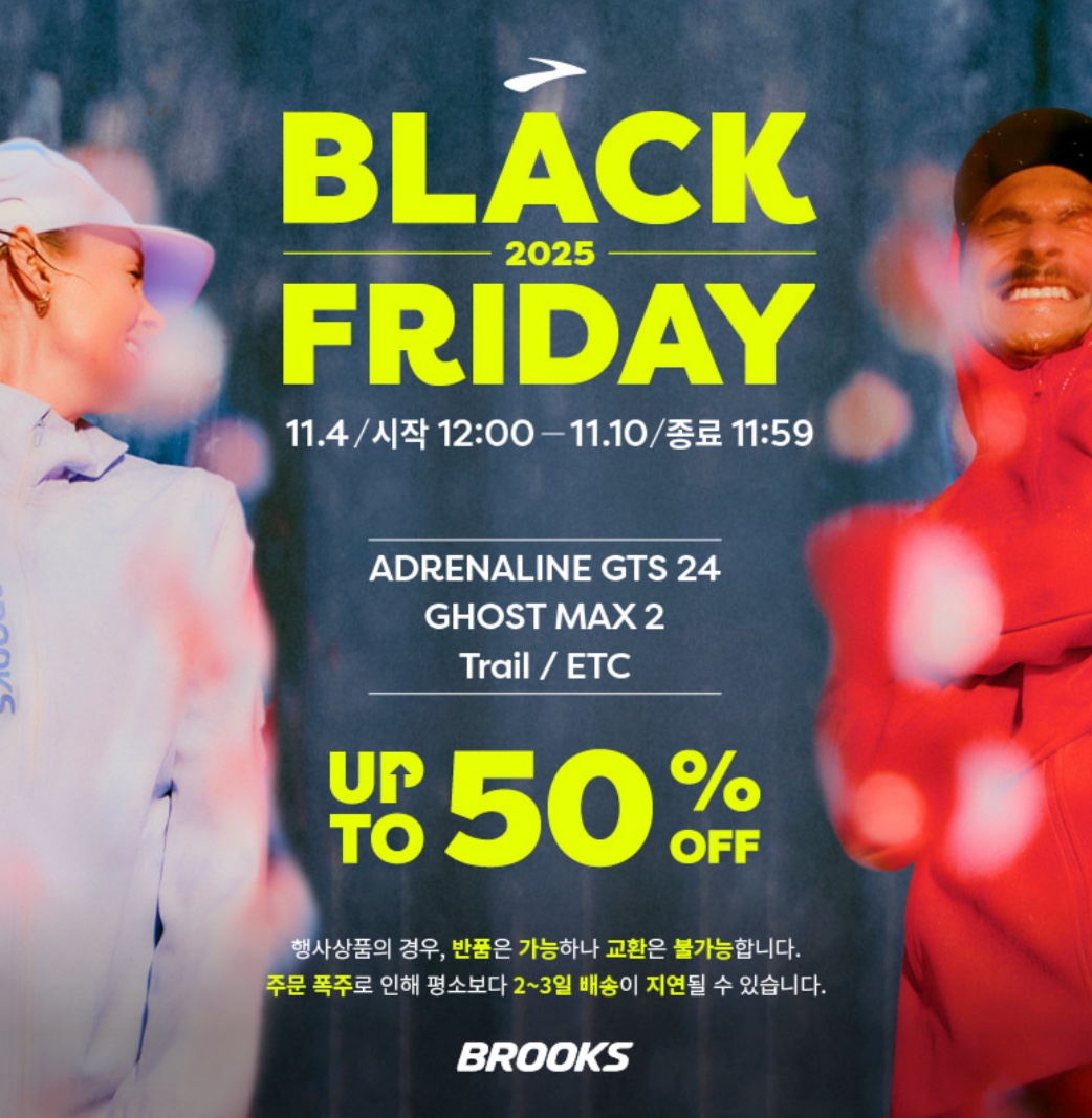 브룩스러닝 블랙프라이데이 세일 — 러너들을 위한 단 1년의 기회!“러닝을 사랑하는 이들을 위한 진짜 블랙프라이데이!” 미국 러너들이 가장 사랑하는 브랜드 Brooks Running(브룩스러닝)이 한 해의 피날레를 장식하는 ‘블랙프라이데이(BLACK FRIDAY)’초대형 세일을 시작했습니다. 11월 4일(화)부터 10일(월)까지 단 7일 동안만 진행되는 이벤트로 브룩스 인기 제품을 최대 50% 할인된 가격으로 구매할 수 있는 기회입니다. 25년 러너들의 선택, 브룩스러닝 블랙프라이데이로 연중 최대 할인 진행 중입니다. 신규가입 10% 할인쿠폰에 50,000원 이상 배송비 무료 혜택도 제공 되니 이번 기회에 브룩스 러닝화 하나 장만해두시는 걸 추천 드립니다! 👉🏻 브룩스 러닝화 블랙프라이데이 세..